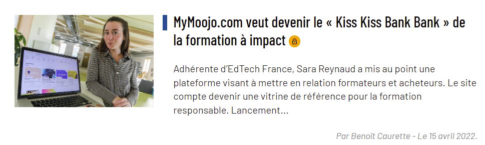 MyMoojo.com veut devenir le « Kiss Kiss Bank Bank » de la formation à impact 15 avril 202225 avril 2022 par Benoît Caurette, publié dans Formation Centre Inffo – Le Quotidien de la formation