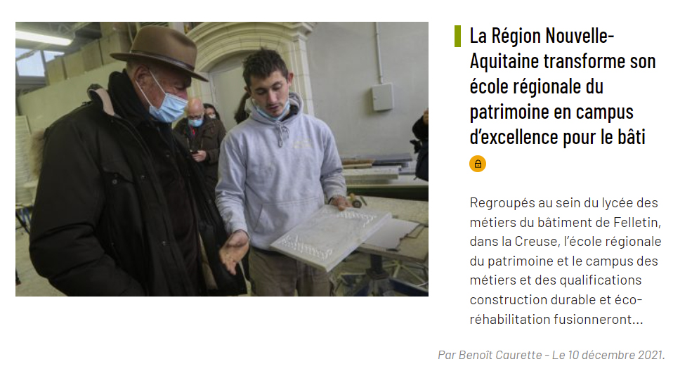 La Région Nouvelle-Aquitaine transforme son école régionale du patrimoine en campus d’excellence pour le bâti
