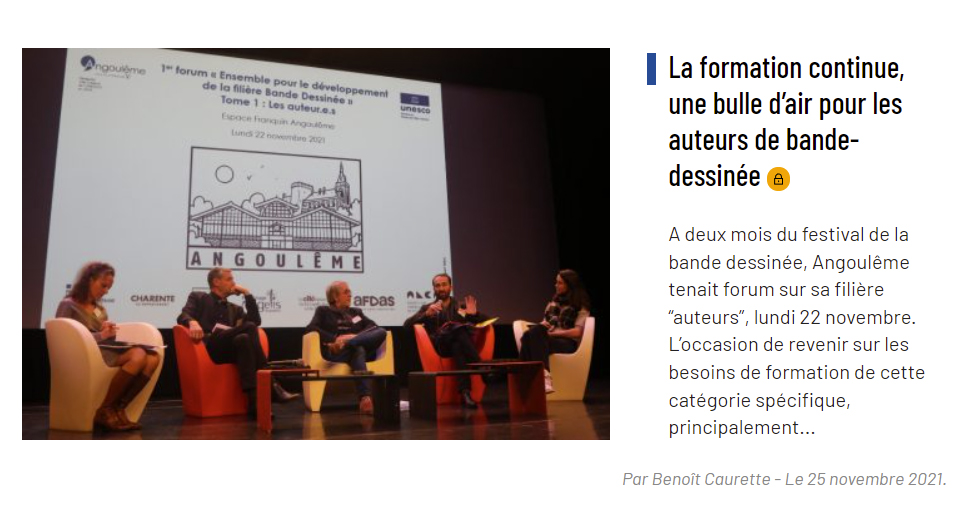 La formation continue, une bulle d’air pour les auteurs de bande-dessinée 25 novembre 2021 par Benoît Caurette, publié dans Formation Centre Inffo – Le quotidien de la formation